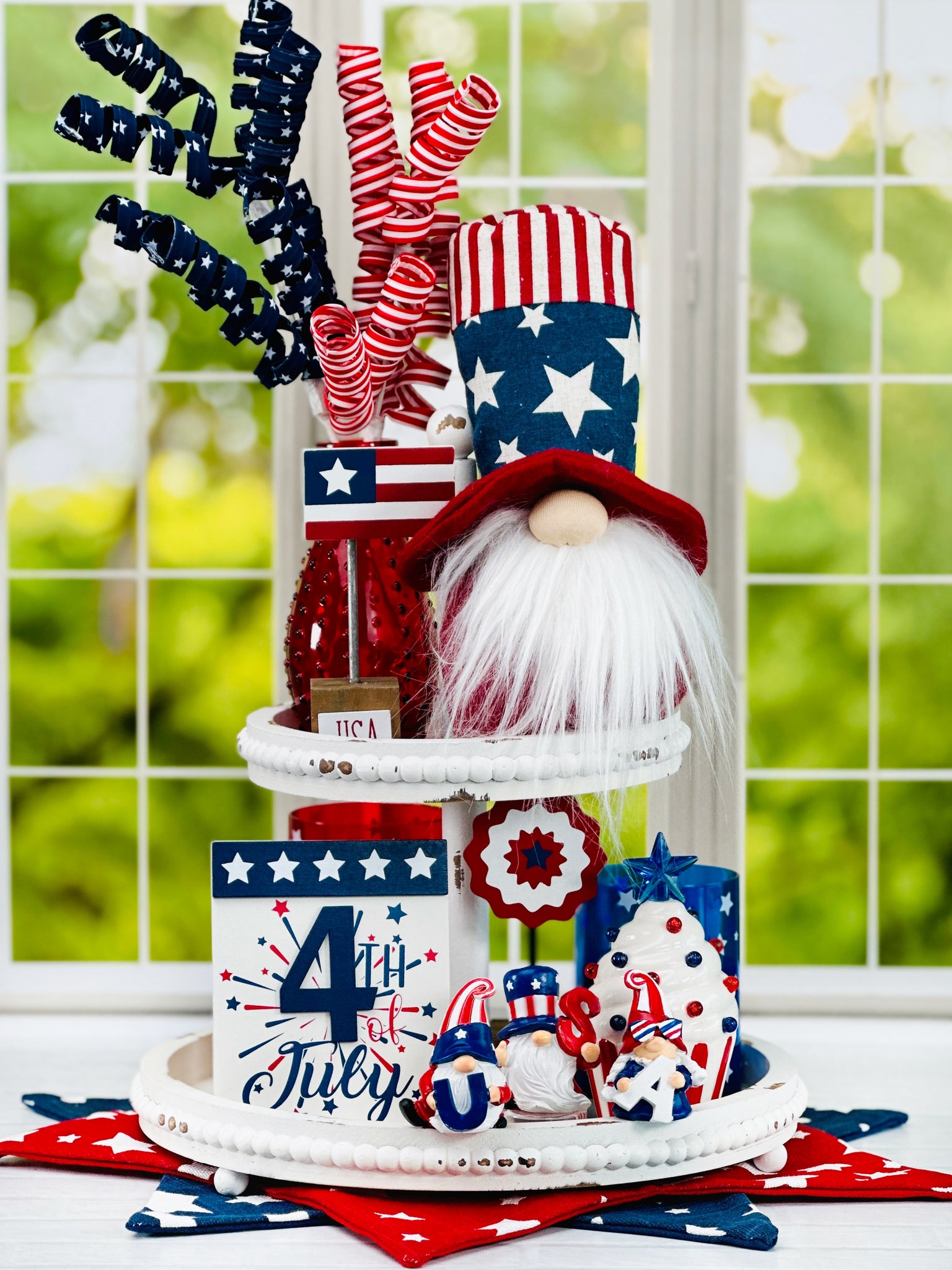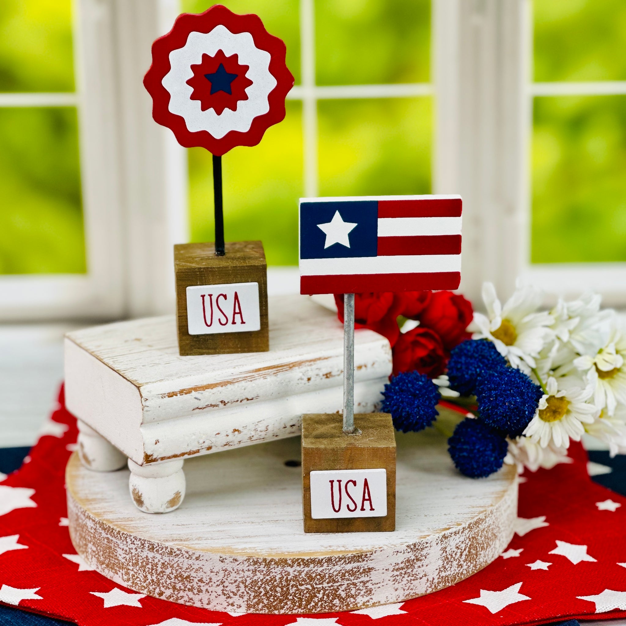 Welcome in a new American classic to your home with this American Flag on USA Block! Perfect for adding a rustic patriotic vibe to your tiered tray display, or just using it to bring red, white, and blue dimension to any small decor space. Made of wood and painted in good ol' stars and stripes, this charm will bring US pride to any spot it lands.