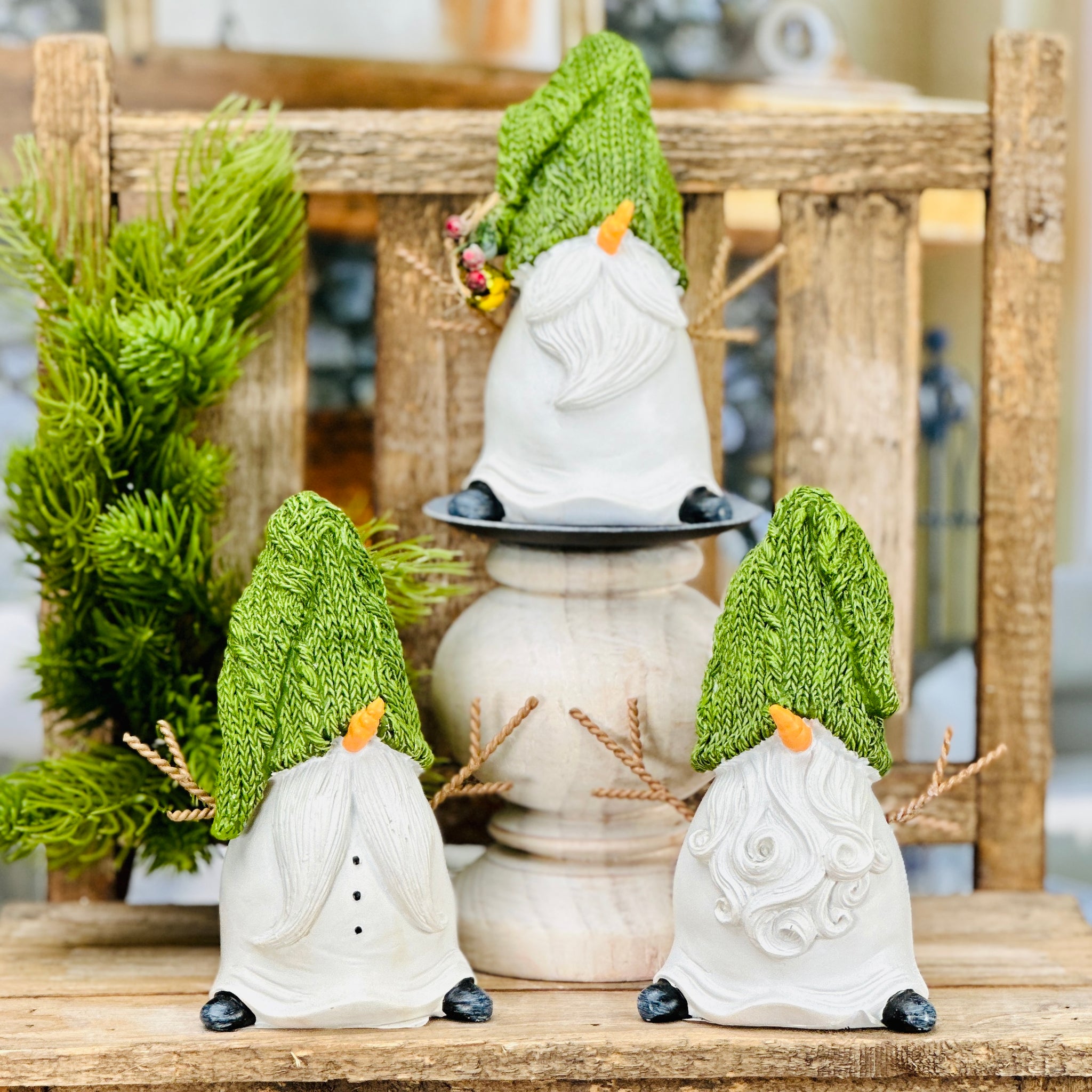 Add a touch of whimsy to your holiday decor with the Bearded Snowman Gnomes. These charming figures are perfect for winter or Christmas and feature snowmen dressed up as gnomes with adorable green sweater hats. Bring some lighthearted fun to your home this holiday season!