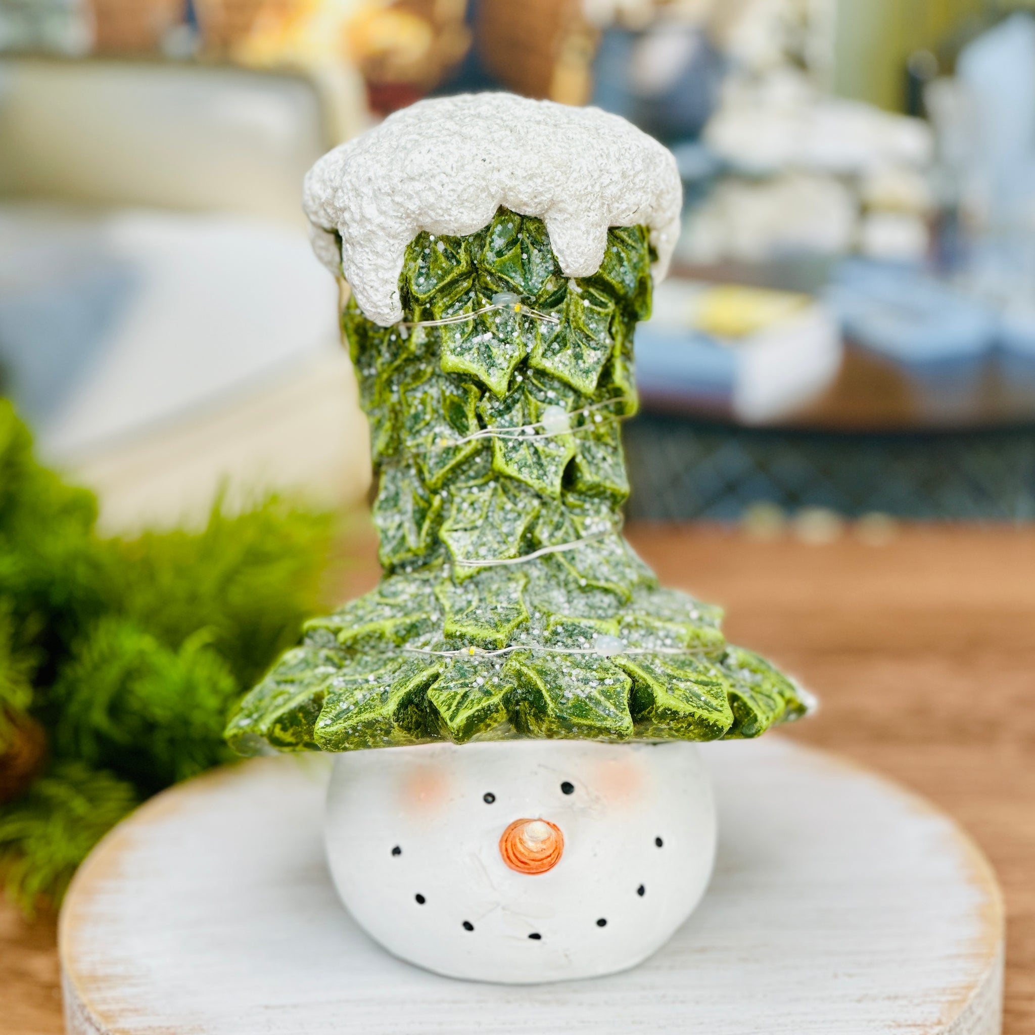 Bring some winter wonderland charm to your home with our Leafy Hat LED Snowman! This tabletop decor features a snowman donning a leafy top hat, coated in glitter for a sugary touch. And with LED lights adorning the hat, it's sure to light up your holiday festivities with a touch of whimsy.